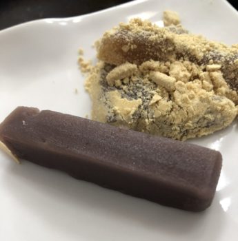 たっぷりのきな粉の中に、ぷるぷるした食感のくず餅が12切れ。