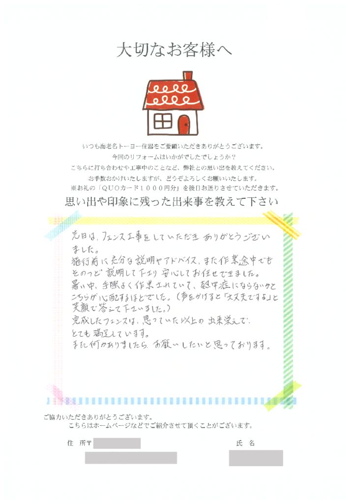 完成したフェンスは思っていた以上の出来栄えで、とても満足しています。