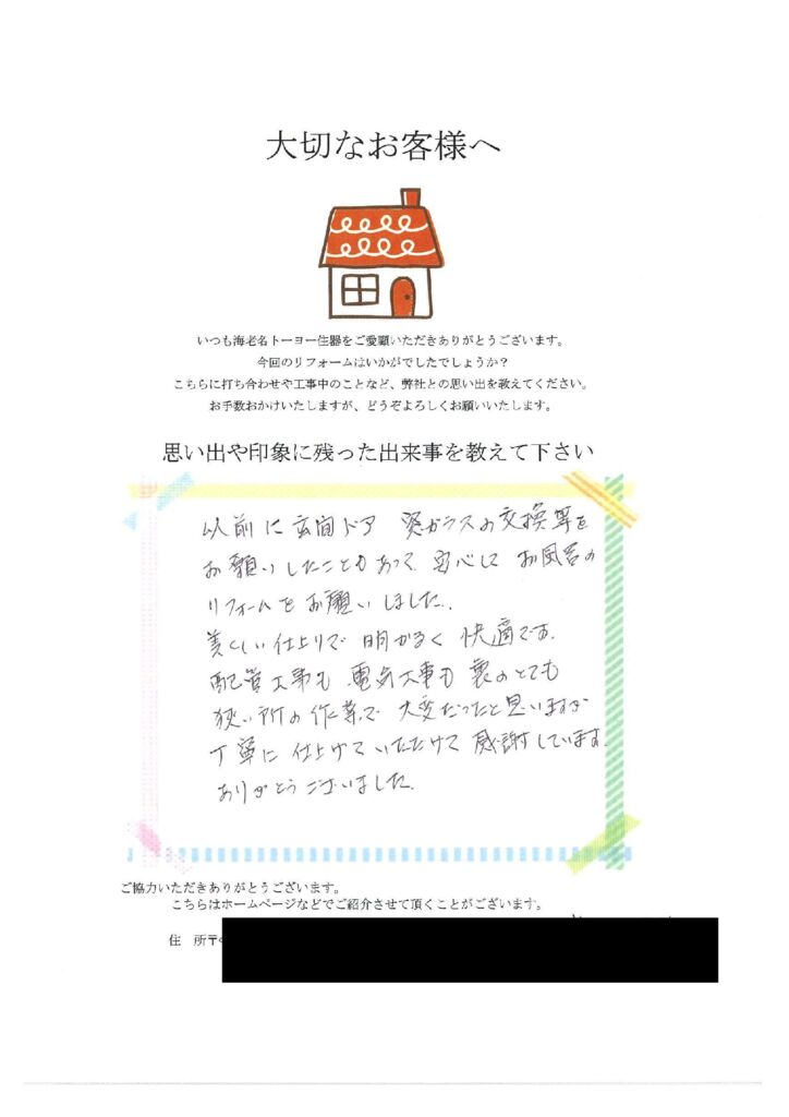 以前に玄関ドア、窓ガラスの交換等をお願いしたこともあって、安心してお風呂のリフォームをお願いしました。