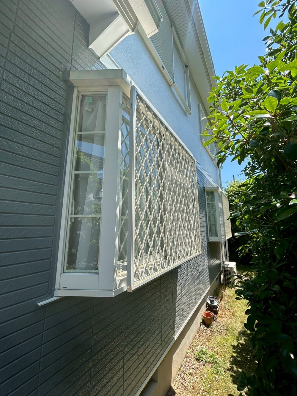 1階8窓ヒシクロス面格子取付※出窓2ケ所あり、袖部は防犯ガラスセキュオ60ガラスに交換をいたしました。