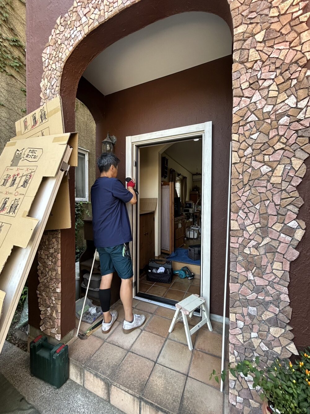 既存のドア枠の上に新しい枠を取り付ける「カバー工法」で施工しており、職人さんが丁寧に作業を進めています。壁を壊すことなく、1日で最新の玄関ドアに生まれ変わります。 -