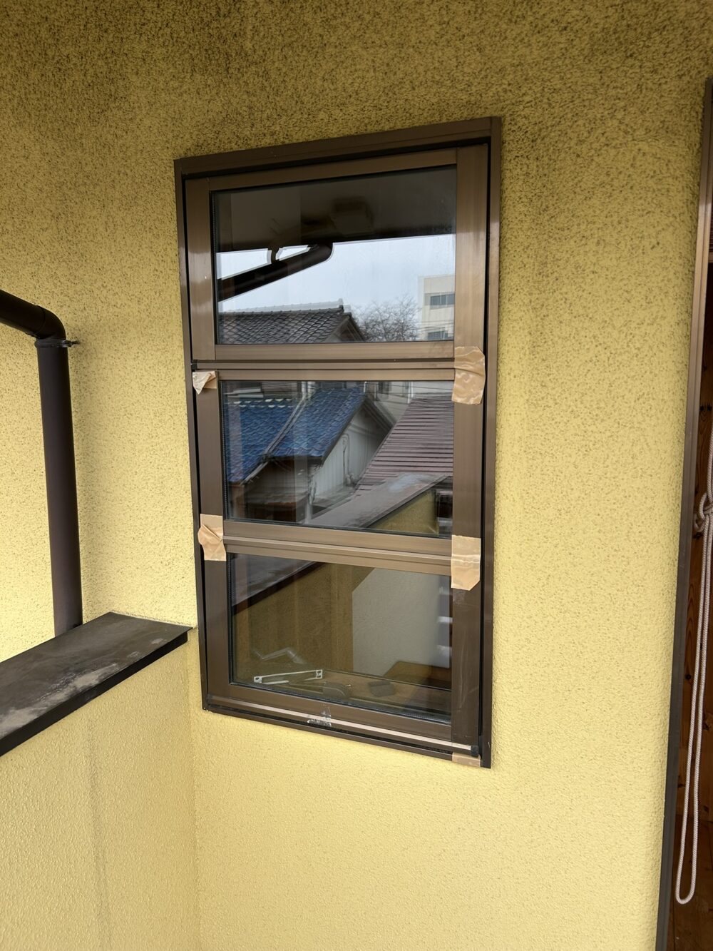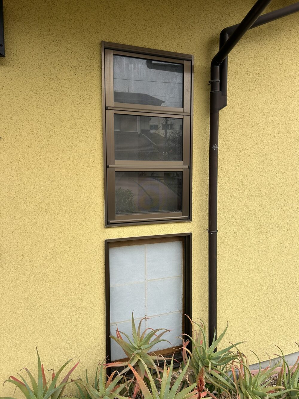 2階 窓2階の窓です。オペレーターハンドルが空回りして全く操作ができず、窓が勝手に開かないようテープで固定して凌いでいる状態でした。部品廃盤のため修理は断念し、1階と同様に「LIXIL リプラス」の縦すべり出し窓へ交換いたしました。3分割されていたガラス面が大きな1枚ガラスになったことで視界が広がり、カムラッチハンドルで確実にロックできるようになったため、防犯性と気密性が大幅に向上しました。