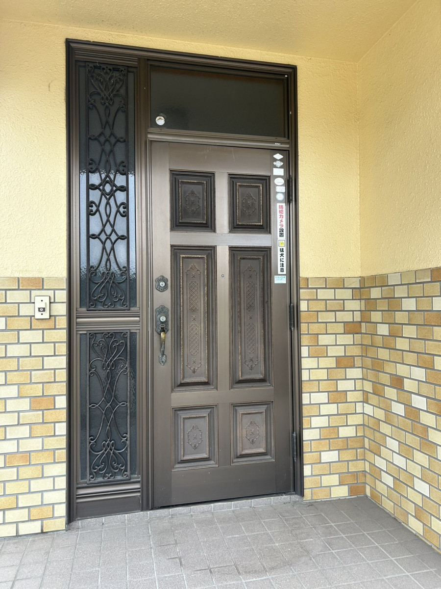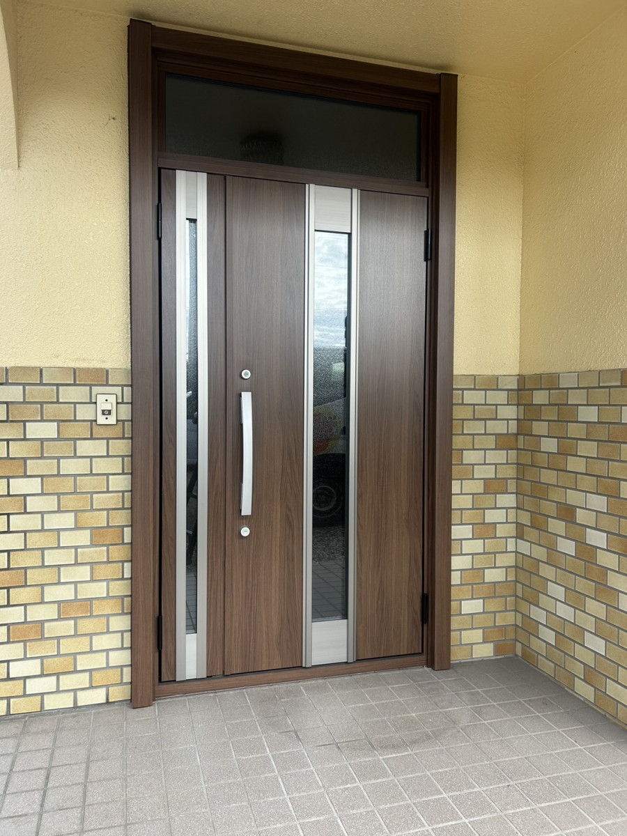 経年劣化で開閉が重くなり、寒さや防犯面にも不安があった築33年のランマ付き片開き玄関ドアを、壁を壊さず1日で完工する「カバー工法」にて、LIXILのリシェント玄関ドア「M77型」の断熱仕様K4・親子ドア(ランマ付き)へリフォームしたことで、クリエモカの木目調が外壁のタイルと調和し、最新の断熱・防犯性能も備わった快適で安心なお住まいの顔へと生まれ変わりました。